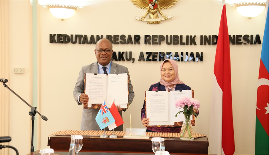 COP29, Baku, Azerbajian – 21 November 2024:  At the margins of COP29 in Baku, the Republic of Fiji signed the ‘Articles of Agreement’ (AoA) to join the G20 Bali Global Blended Finance Alliance (G20 Bali GBFA) as country member with host country Indonesia. The AoA Signing ceremony was represented by H.E. Amena Yauvoli, Fiji’s Ambassador to Indonesia and H.E. Nani Hendiarti, Deputy Minister for Food Affordability and Security of Coordinating Ministry Food Affairs and the presence of other senior Indonesian Government officials in Baku.